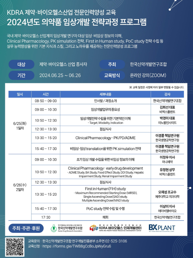 BXPLANT is proud to announce that Co-CEO Heesun Kim and Executive Director Jeonghyun Yu will serve as instructors for the upcoming Drug Product Development Strategy Program. This engagement demonstrates BXPLANT’s commitment to advancing industry expertise and contributing to the professional development of Korea’s bio healthcare workforce.