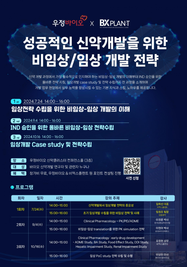 BXPLANT, in collaboration with Woojung BIO, is pleased to invite you to an insightful seminar on preclinical and clinical development strategies essential for successful new drug development.